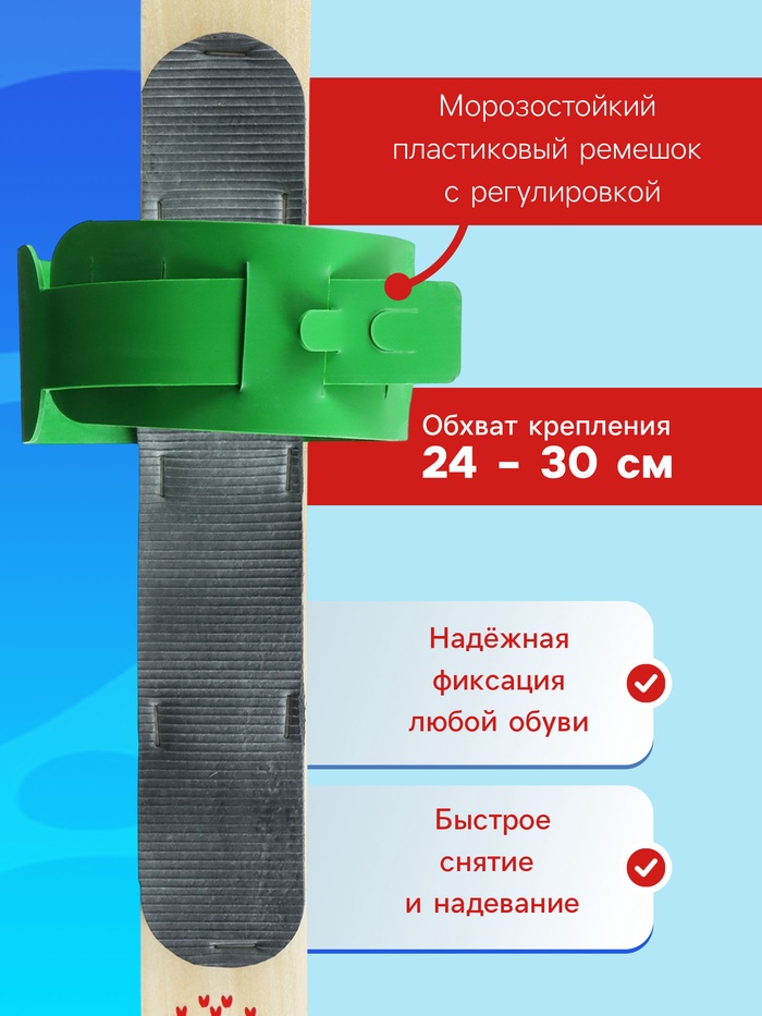 Универсальные крепления представлены в виде морозостойкого пластикового ремешка с регулировкой. Резиновые накладки обеспечивают сцепление с обувью и препятствуют налипанию снега. На нижней поверхности лыжи есть продольная канавка для уменьшения бокового скольжения.