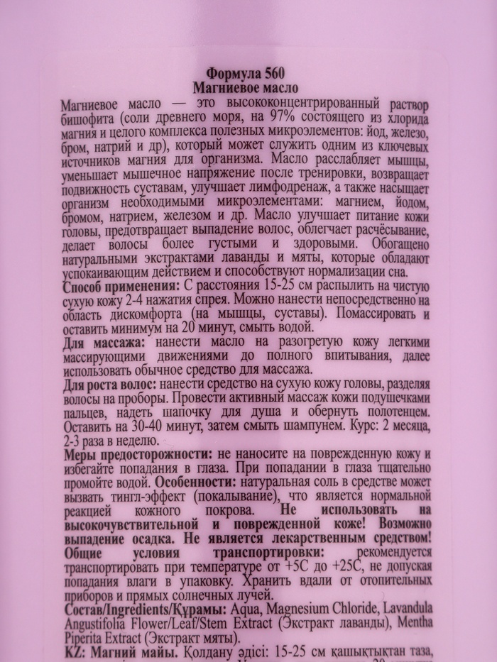 Это высококонцентрированное магниевое масло на основе бишофита – природной соли древнего моря, содержащей 97% хлорида магния и комплекс полезных микроэлементов: йод, железо, бром, натрий и др. Средство служит эффективным источником магния для организма, помогая восстановлению после физических нагрузок и укреплению здоровья в целом.