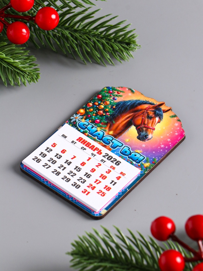 Встречайте год Огненной Лошади с особым настроением! Магнит-календарь «Новогодний конь» на 2026 год — это стильный аксессуар, который объединяет символ года, практичность и уютное предвкушение праздника. Деревянная основа дарит приятные тактильные ощущения и делает каждый день немного теплее.