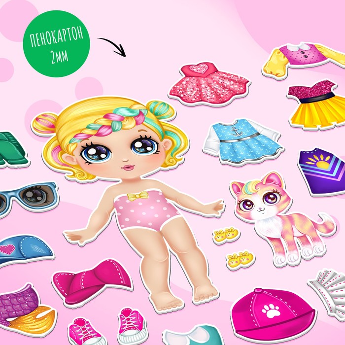 - Выберите подходящий наряд и аксессуары, а затем приложите их к кукле. Одежда приклеится к ней благодаря магнитной ленте.