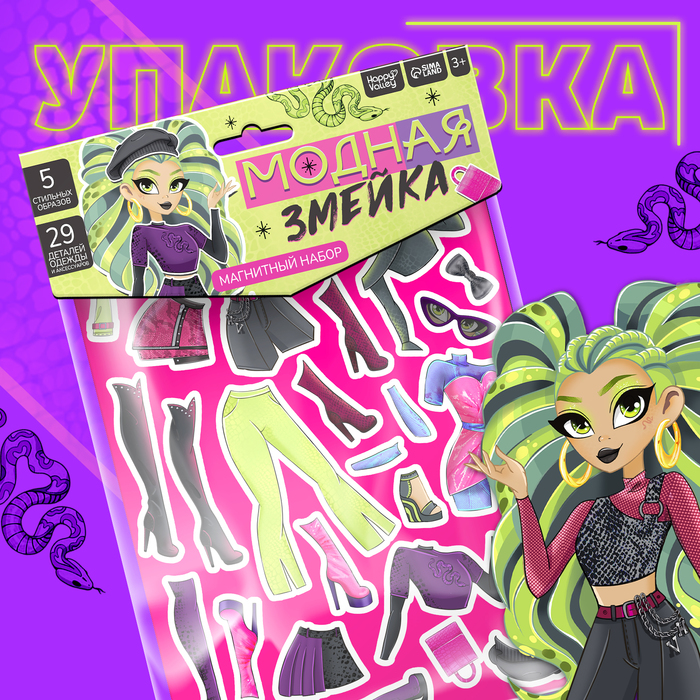 Хотите создать свой собственный модный бренд? Начните с магнитного набора «Модная змейка». В набор входит всё необходимое для создания 5 модных образов для стильной змейки. 29 элементов одежды позволят вам экспериментировать с различными стилями.