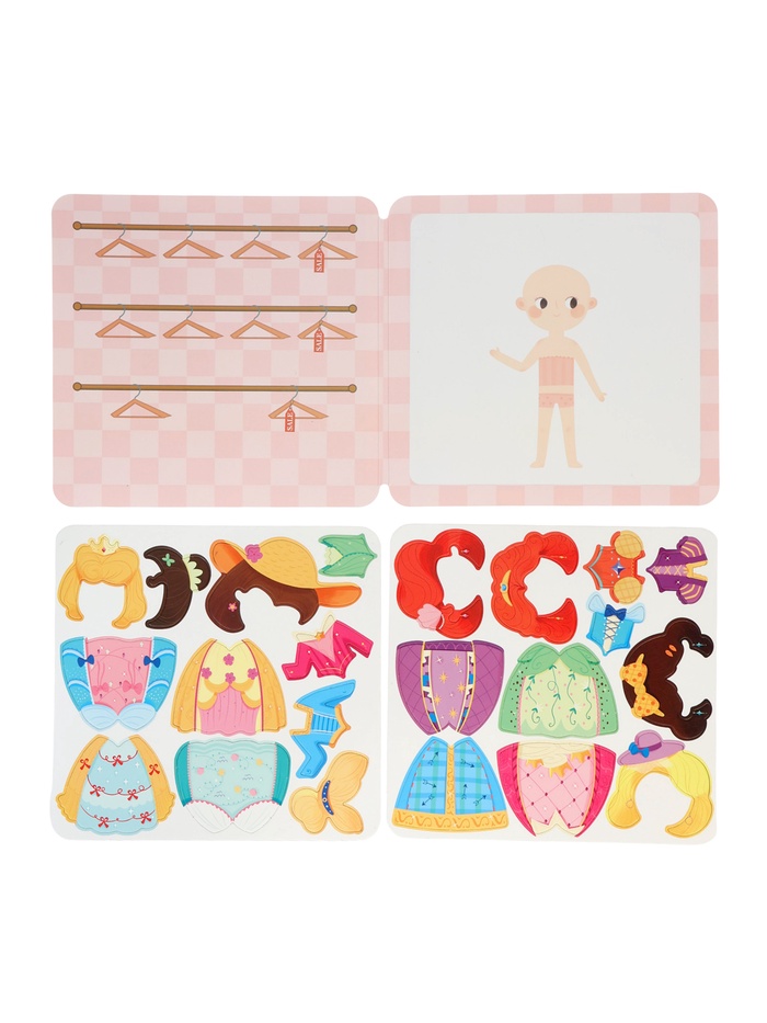 Как играть? Ребёнок выбирает карточку-принцессу и дополняет её образом, комбинируя магнитные элементы. Можно менять причёски, сочетать юбки и верхние элементы одежды, создавать новые наряды и собирать целые коллекции образов. Магнитные детали легко крепятся и так же легко снимаются, поэтому игра остаётся увлекательной, динамичной и удобной даже в дороге.