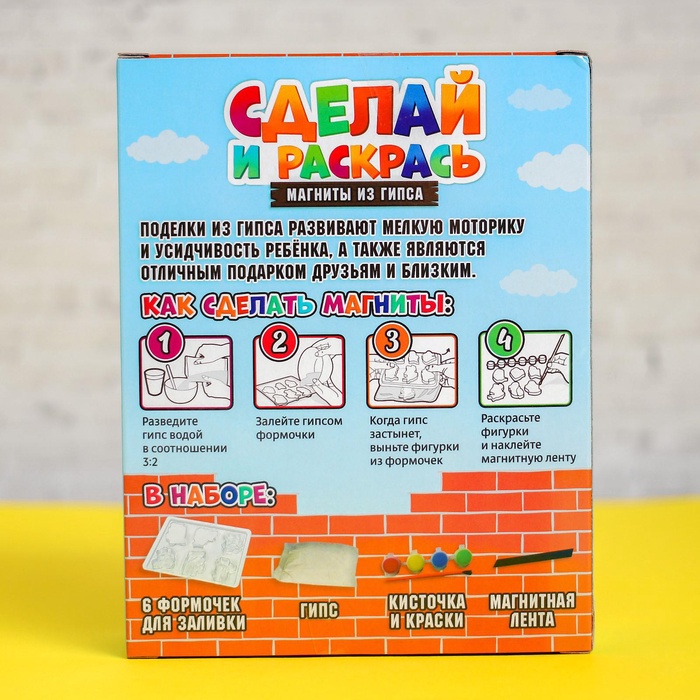 В процессе создания магнитов из гипса ребёнок получит массу радостных впечатлений! Чтобы их сделать, нужно смешать гипс с водой, залить в формочку и подождать, пока они застынут. После чего раскрасить яркими красками и приклеить магнитную ленту. Такая игрушка станет украшением на холодильнике или подарком для друзей!