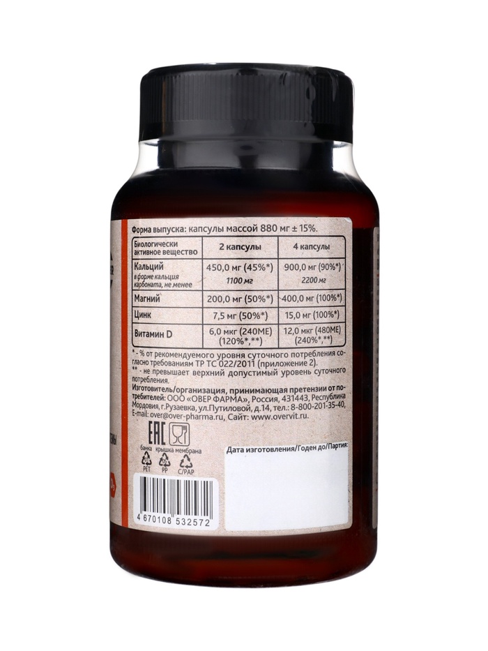 Магний+Кальций+Цинк+Витамин D3 OVERvit, 120 капсул — это комплексное средство для поддержания здоровья костей, суставов и мышечной системы, а также для укрепления иммунитета и общего тонуса организма. Сочетание минералов магния, кальция и цинка с витамином D3 способствует нормальному усвоению кальция, поддерживает структуру костей и зубов, улучшает работу мышц и нервной системы, а также способствует защите организма от стрессов и повышенной физической нагрузки.
