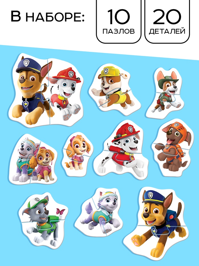 - В наборе 10 пазлов с изображением героев «Щенячьего патруля».