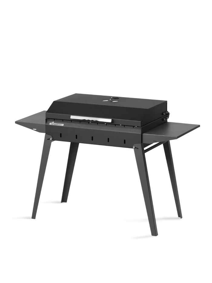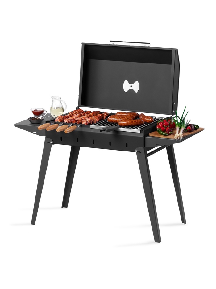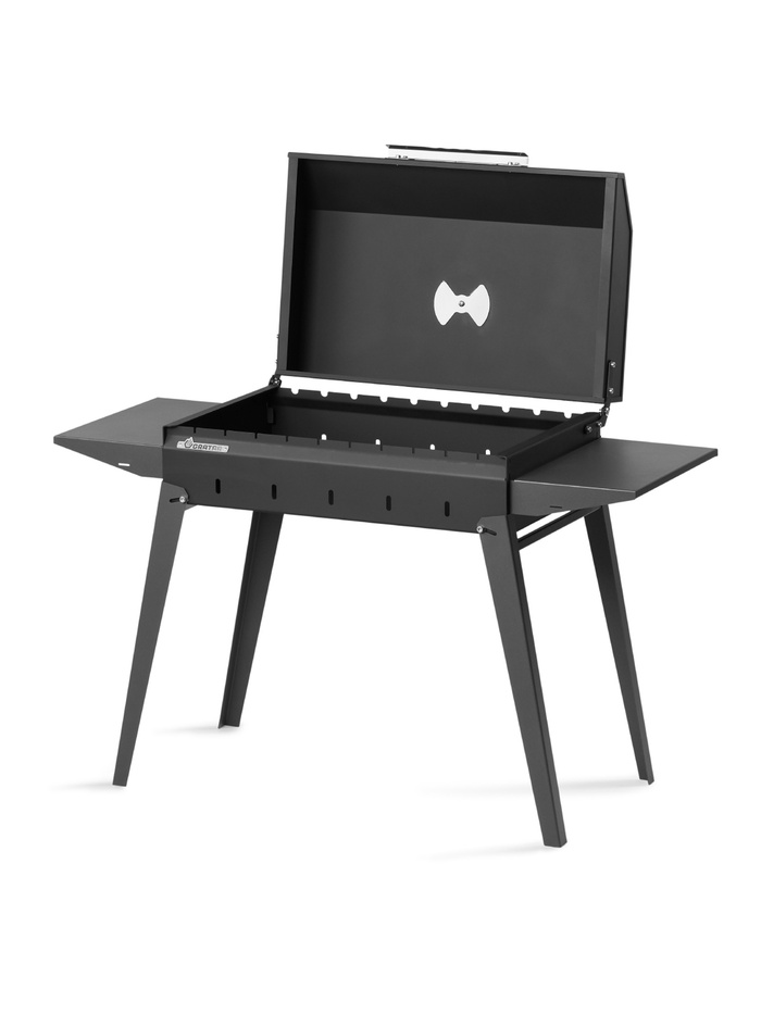 Рабочая зона шириной 60 см рассчитана на размещение до 11 шампуров, что позволяет готовить одновременно до 2,5 кг мяса. Усиленная топка выдерживает дровяную растопку. В комплект входит удобная крышка барбекю с термоизолированной ручкой, открывающая новые возможности приготовления блюд. Складные ножки обеспечивают компактность, а две боковые полки создают дополнительное пространство для размещения продуктов и инструментов.