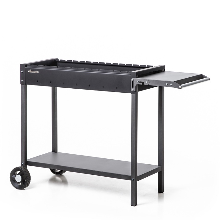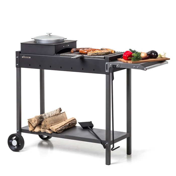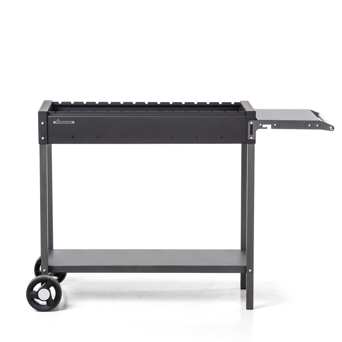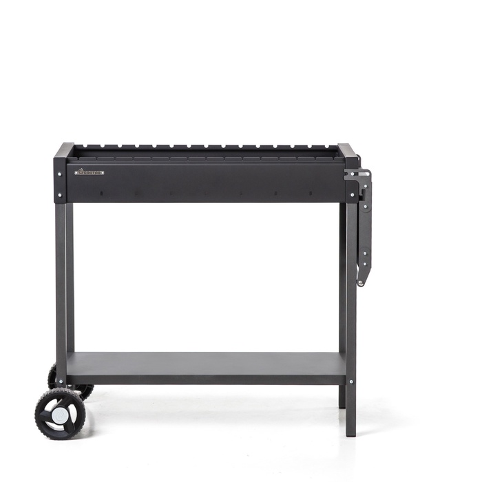 Мангал изготовлен из стали толщиной 3 мм, что обеспечивает высокую устойчивость к температурным нагрузкам и длительный срок службы. Рабочая зона шириной 85 см рассчитана на размещение до 15 шампуров и позволяет готовить до 3,5 кг мяса одновременно, что делает модель отличным выбором для большой компании.