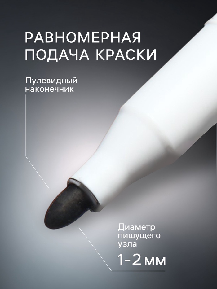 Прочный фибровый наконечник не западает в корпус и сохраняет форму на протяжении всего срока службы. След от маркера легко удаляется сухой губкой. Пулевидный наконечник позволяет наносить яркие и однородные линии толщиной 1-2 мм. Цвет чернил - черный. Упаковка: картонная коробочка по 12 штук.