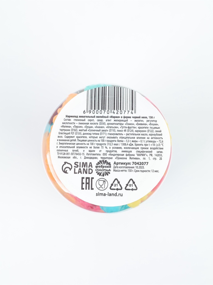 Состав: глюкозный сироп, сахар, агент желирующий – желатин, регулятор кислотности – лимонная кислота (Е330), ароматизаторы: «Лимон», «Ежевика», «Вишня», «Малина», «Персик», «Груша», «Ананас», «Апельсин», «Тутти-фрутти»; красители пищевые: тартразин (Е102), желтый «Солнечный закат» (Е110), понсо 4R (Е124), кармуазин (Е122), синий блестящий FCF (Е133), диоксид титана (Е171); глазирователь – растительное масло, карнаубский воск.