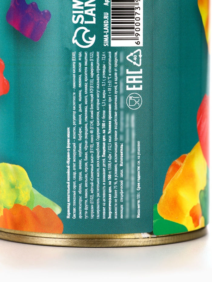 Состав: глюкозный сироп, сахар, агент желирующий – желатин, регулятор кислотности – лимонная кислота (Е330), ароматизаторы: «Яблоко», «Груша», «Ананас», «Клубника», «Барбарис», «Вишня», «Дыня», «Малина», «Ежевика», «Лесная ягода», «Тутти-фрутти», «Лимон», «Апельсин», «Персик», «Банан», «Черная смородина», «Земляника», «Манго», «Клюква», красители пищевые: тартразин (Е102), желтый «Солнечный закат» (Е110), понсо 4R (Е124), синий блестящий FCF (Е133), кармуазин (Е122), глазирователь – растительное масло, воск карнаубский.
