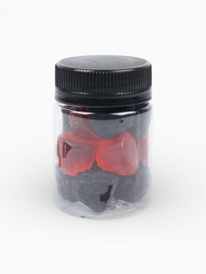 Состав: глюкозный сироп, сахар, агент желирующий – желатин, регулятор кислотности – лимонная кислота (Е330), ароматизаторы: «Малина», «Ежевика», «Барбарис», красители пищевые: кармуазин (Е122), понсо 4R (Е124), индигокармин (Е132), черный блестящий PN (Е151), глазирователь: растительное масло, воск карнаубский.