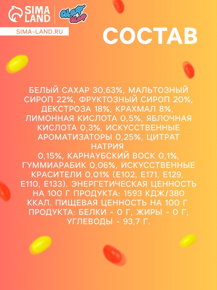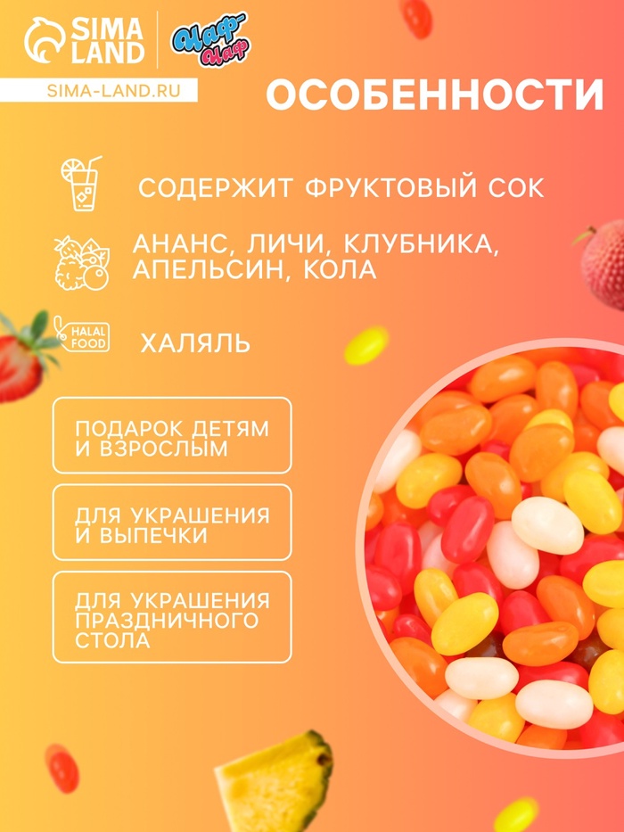 Погрузитесь в мир фруктовых наслаждений с жевательным мармеладом "Бобы желе"! Эти яркие, аппетитные конфеты в форме бобов станут вашим идеальным компаньоном для сладкого перекуса и подарят вам радость с каждой порцией.