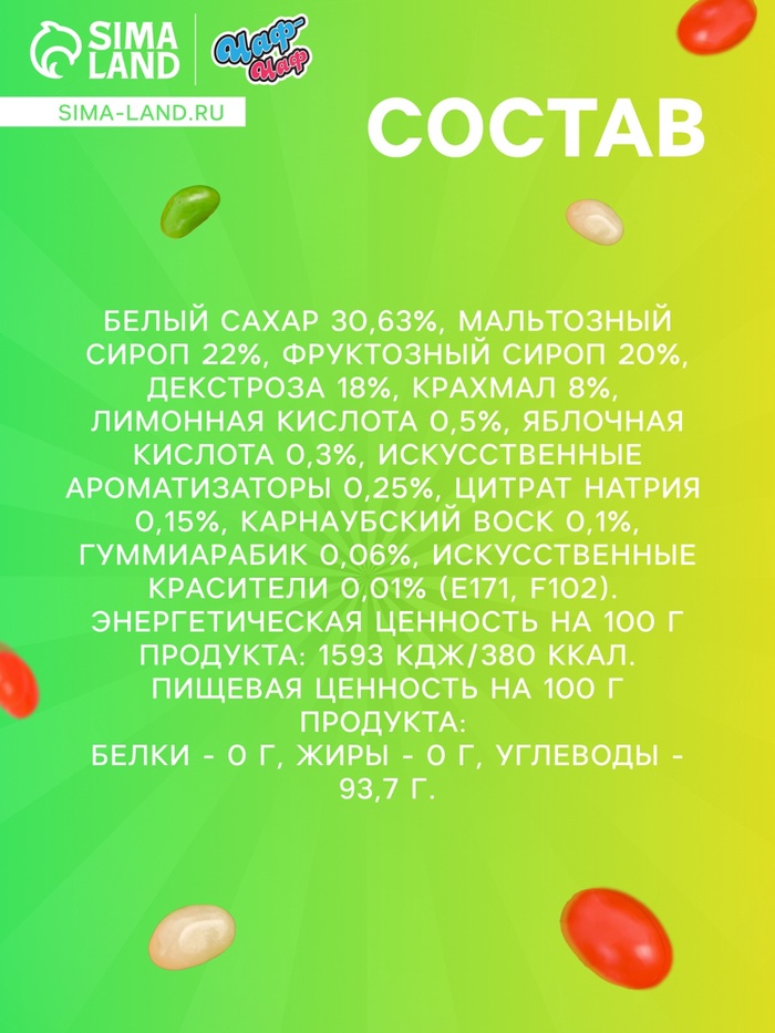 Жевательный мармелад "Бобы желе" – это идеальное угощение для всех, кто ценит сочные, натуральные вкусы. Удобная упаковка делает его отличным выбором для совместных посиделок, праздников или просто для сладкого перекуса в течение дня. Подарите себе радость и наслаждение с каждым кусочком этих восхитительных бобов!