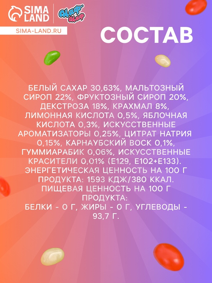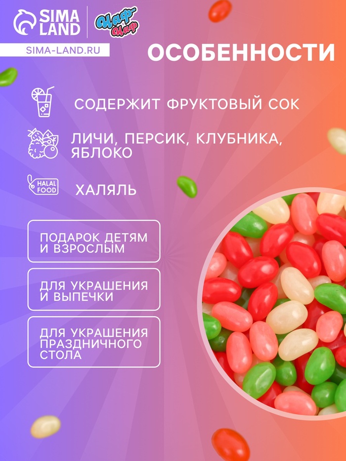 Подарите себе настоящий праздник вкуса с жевательным мармеладом "Бобы желе"! Эти яркие и аппетитные конфеты в форме бобов предлагают вам уникальное сочетание фруктовых вкусов, каждый из которых подарит вам незабываемые ощущения.
