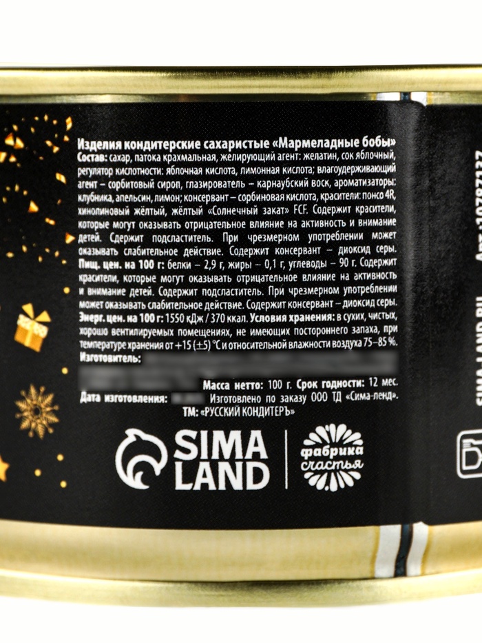 Состав: сахар, патока крахмальная, желирующий агент: желатин, сок яблочный, регулятор кислотности: яблочная кислота, лимонная кислота; влагоудерживающий агент – сорбитовый сироп, глазирователь – карнаубский воск, аромаизаторы: клубника, апельсин, лимон; консервант – сорбиновая кислота, красители: понсо 4R, хинолиновый жёлтый, жёлтый «Солнечный закат» FCF.
