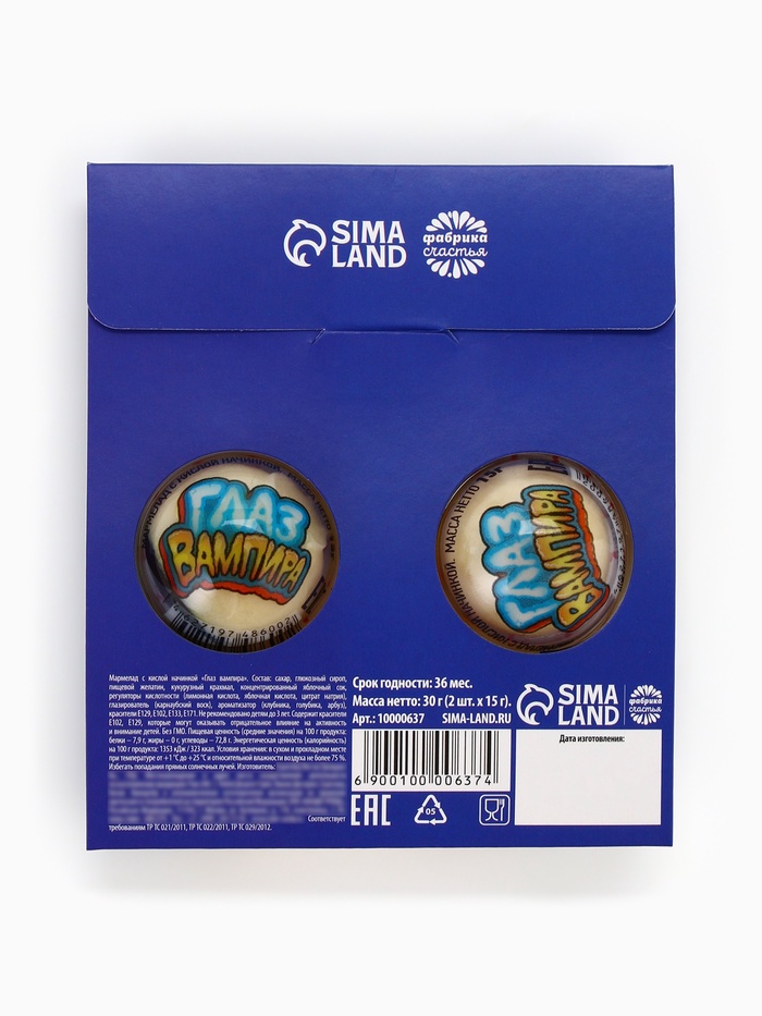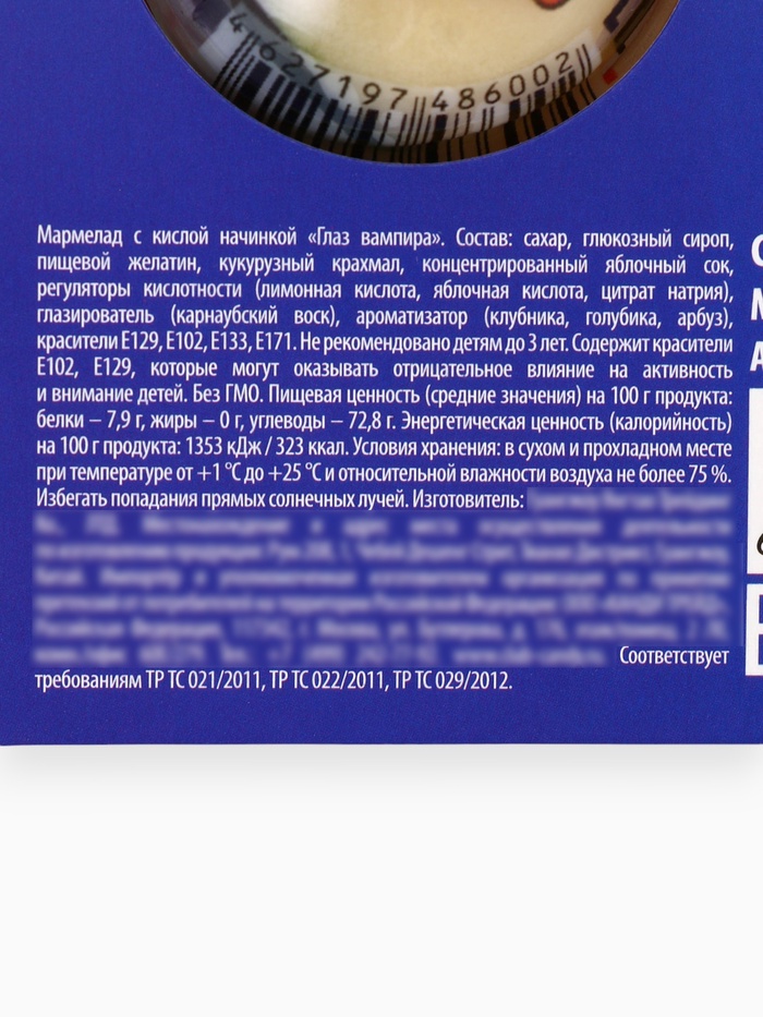 Состав: сахар, глюкозный сироп, пищевой желатин, кукурузный крахмал, концентрированный яблочный сок, регулятор кислотности (лимонная кислота, яблочная кислота, цитрат натрия), глазирователь (карнаубский воск), ароматизатор (клубника, голубика, арбуз), красители Е129, Е102, Е133, Е171.