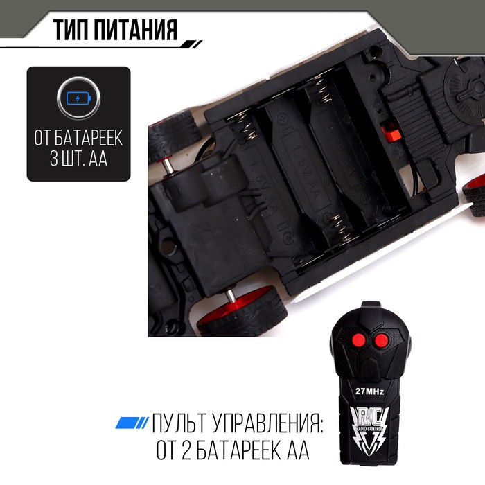 Машина функционирует от 3 батареек типа АА, пульт — от 2 батареек типа АА. Элементы питания в комплектацию не входят.