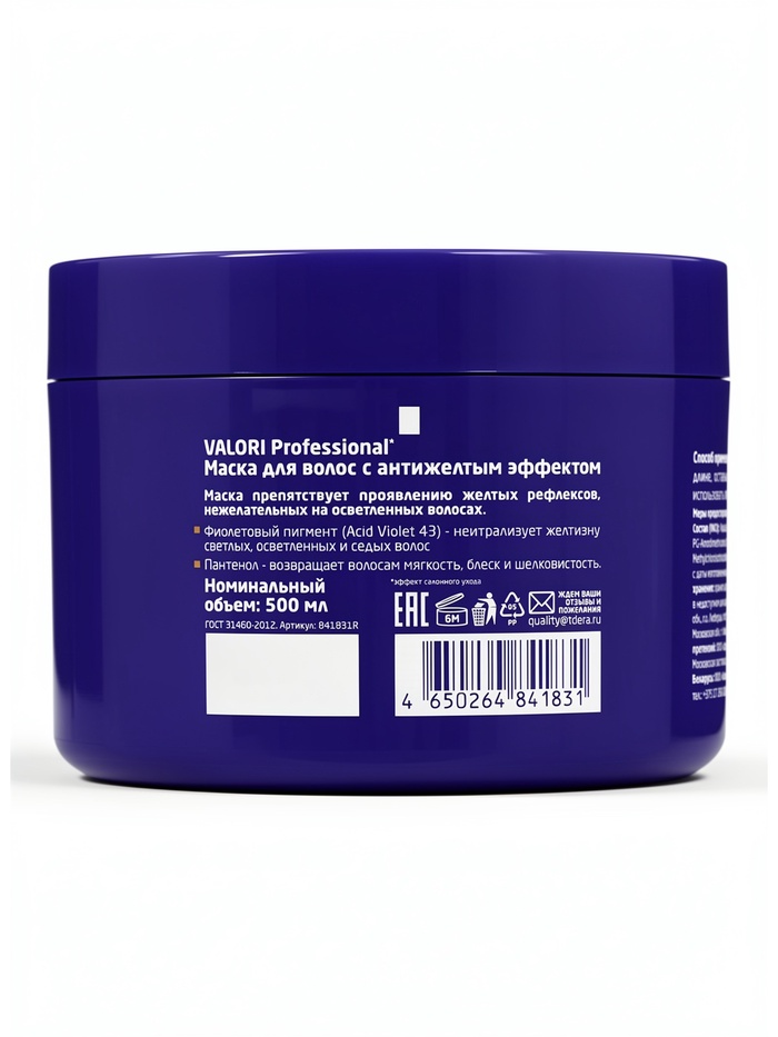 Маска для светлых и седых волос Valori Professional, антижёлтая, 500 мл