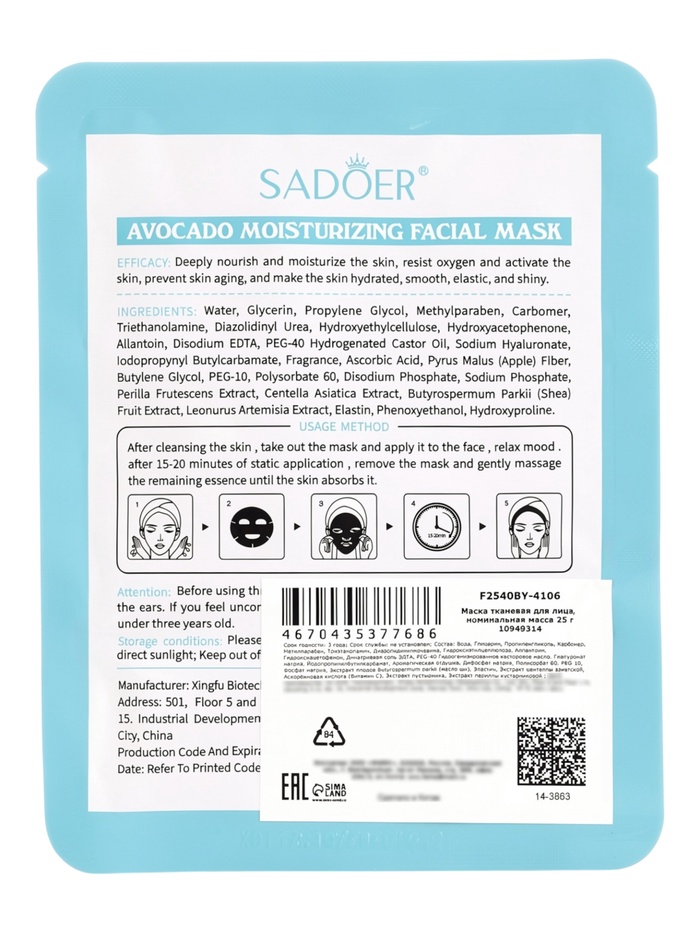 Тканевая увлажняющая маска для лица с экстрактом авокадо — это эффективное средство для интенсивного увлажнения, питания и восстановления кожи. Маска помогает сделать кожу мягкой, гладкой и сияющей, возвращая ей здоровый и ухоженный вид.