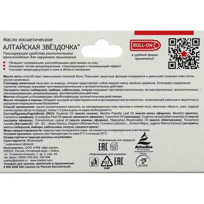 Состав: масло соевое, масло мяты эфирное, ментол, камфора, масло эвкалипта эфирное, скипидар, масло гвоздики эфирное, масло корицы эфирное, масло облепиховое, витамин Е, экстракты пихты сибирской, имбиря, сабельника, лопуха, грецкого ореха.