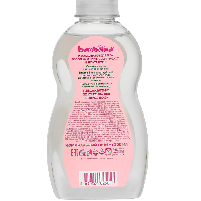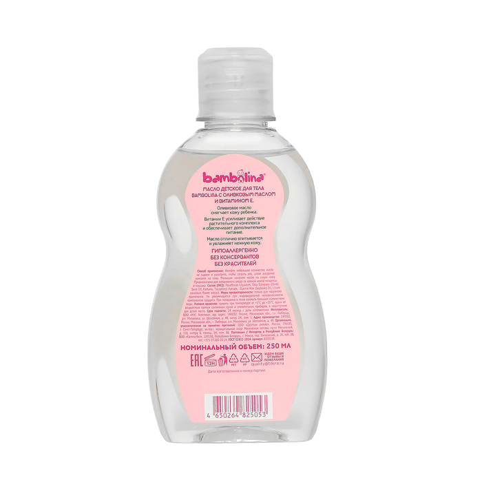 Детское масло для тела Bambolina с оливковым маслом и витамином Е 0+ 250 мл - это идеальное средство для ухода за кожей малыша. Оно разработано специально для детей с рождения и не содержит вредных веществ.