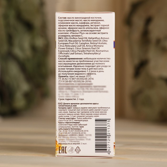 Регулярный массаж с использованием масла устраняет появление целлюлита, предотвращает его повторное проявление, повышает тонус, подтягивает и выравнивает кожу. Эфирные масла, экстракт арники и камфора входящие в состав масла рекомендуются для сокращения жировых отложений, повышения упругости кожи, вывода шлаков, устранения застойных явлений и эффекта «апельсиновой корки».