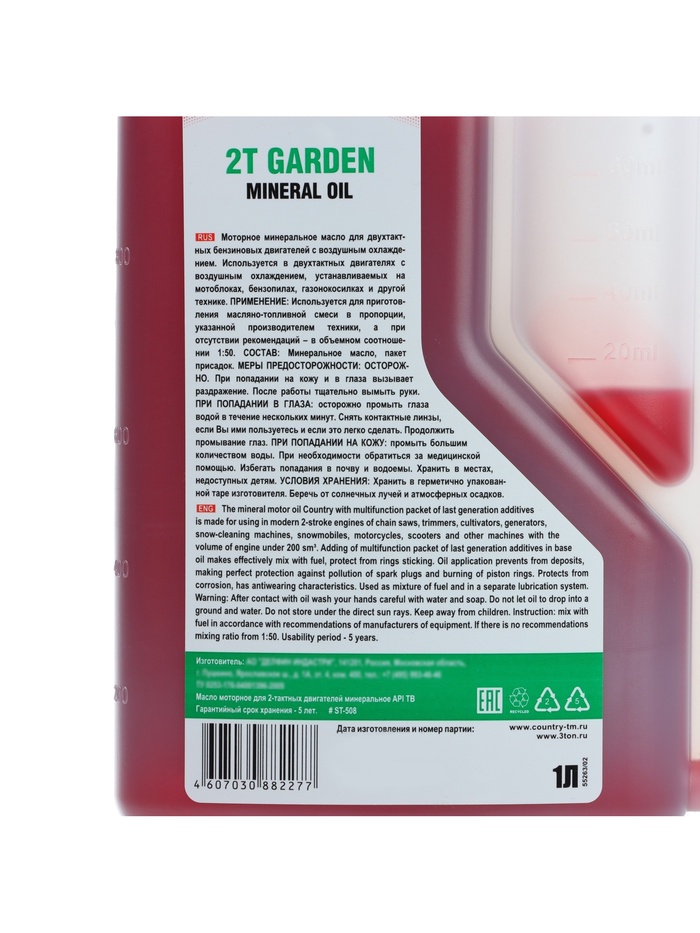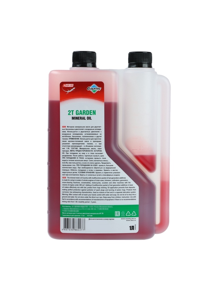 Предназначено для систем с инжекторной подачей масла или систем, работающих на смеси масла с топливом. Специальные добавки предотвращают формирование отложений на поршнях, приводящих к залипанию компрессионных колец и обеспечивают гладкую работу двигателя. При использовании Country 2T резко снижается содержание вредных веществ в выхлопных газах.