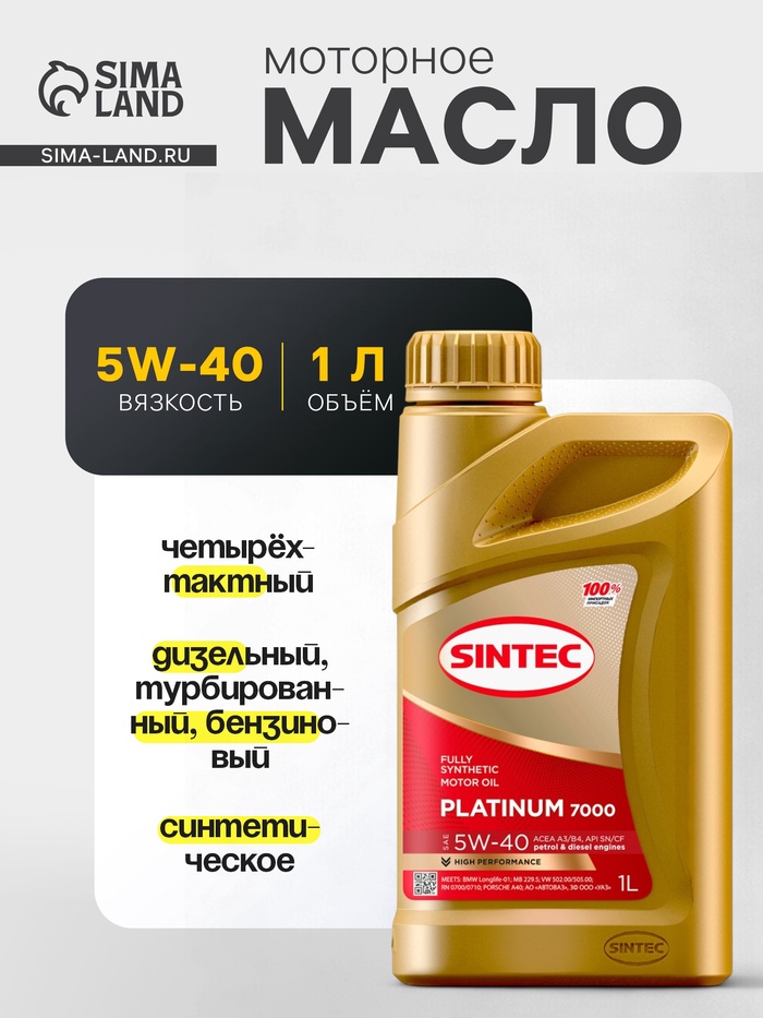 SINTEC PLATINUM SAE 5W-40, API SN/CF производится из синтетических базовых масел и высокоэффективного многофункционального пакета присадок. Синтетические базовые масла обеспечивают отличные низкотемпературные и термоокислительные свойства, что обеспечивает лёгкий пуск в самых суровых погодных условиях и увеличенный интервал замены масла, даже при высоких нагрузках на ДВС. Противоизносные и моюще-диспергирующие присадки последнего поколения гарантируют непревзойдённую защиту и чистоту двигателя на весь срок службы масла.