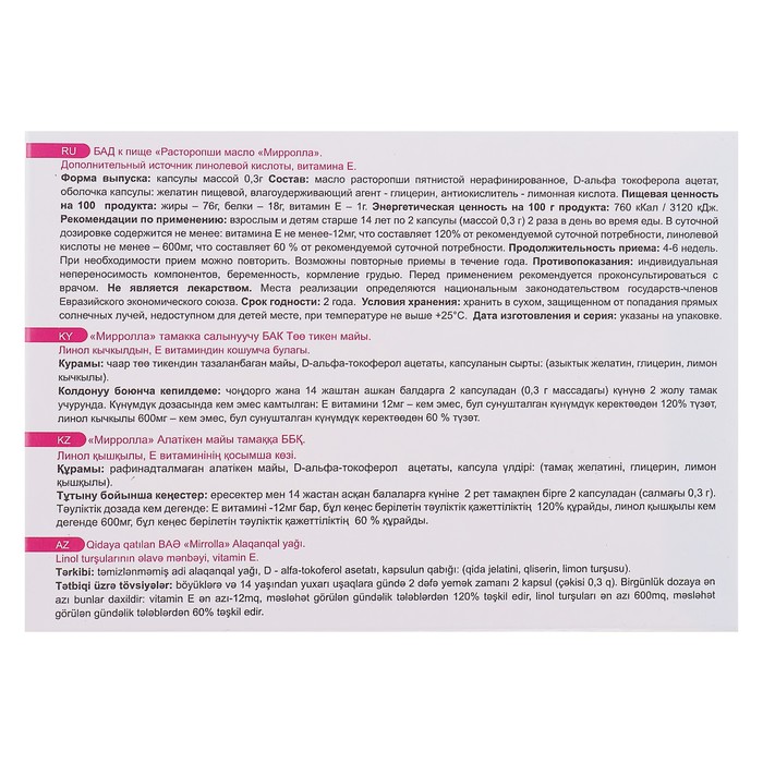 Применение: взрослым принимать по 4 капсулы 3 раза в день во время еды. Это обеспечивает 16 % адекватного уровня поступления ПНЖК и 13 % витамина Е. Продолжительность курса: 1–2 месяца, при необходимости приём можно повторять. Перед применением рекомендуется проконсультироваться с врачом.