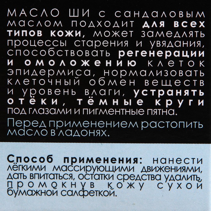 Масло ши с сандаловым маслом подходит для всех типов кожи, может замедлять процессы старения и увядания, способствовать регенерации и омоложению клеток эпидермиса, нормализовать клеточный обмен веществ и уровень влаги, устранять отёки, тёмные круги под глазами и пигментные пятна.