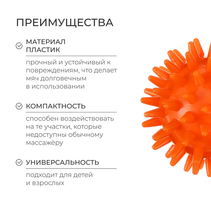 Мяч с шипами подходит для детей и взрослых. Благодаря своим компактным размерам, он способен воздействовать на те участки, которые недоступны обычному массажёру. При помощи массажа мячом снимается стресс и напряжение, улучшается самочувствие, устраняется усталость, повышается общий тонус организма.