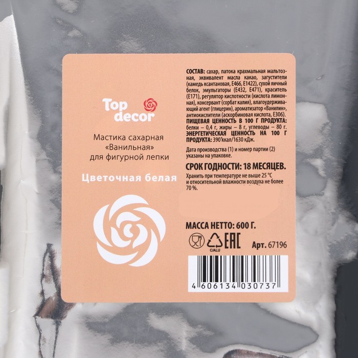 Способ применения: перед использованием рекомендуется размять необходимое количество мастики до получения мягкой пластичной консистенции на сухой, слегка подпыленной крахмалом поверхности; изготовить элемент декора.