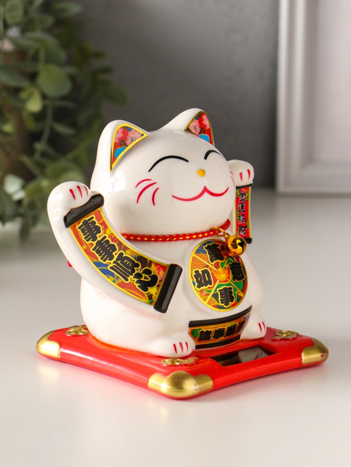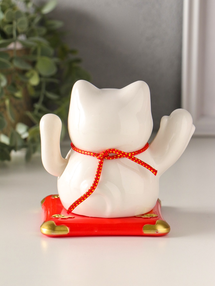 - Изящная керамическая фигурка кошки с традиционным красным акцентом.