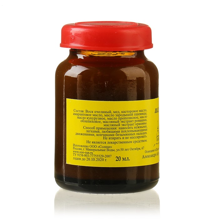 Состав: воск пчелиный, мед, касторовое масло, амарантовое масло, масло зародышей пшеницы, масло кукурузное, масло прополисное, масло облепиховое, масляный экстракт ромашки, масляный экстракт крапивы.