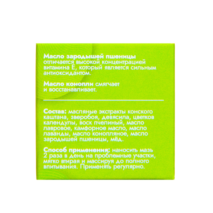 Масляные экстракты конского каштана, зверобоя, девясила, цветков календулы, воск пчелиный, масло лавровое, камфорное масло, масло лаванды, масло конопляное, масло зародышей пшеницы, мёд.