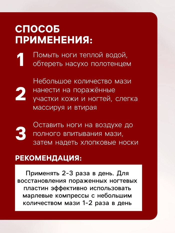 Способ применения:помыть ноги теплой водой, обтереть насухо полотенцем. Небольшое количество мази нанести на поражённые участки кожи и ногтей, слегка массируя и втирая. Оставить ноги на воздухе до полного впитывания мази, затем надеть хлопковые носки. Применять 2-3 раза в день. Для восстановления пораженных ногтевых пластин эффективно использовать марлевые компрессы с небольшим количеством мази 1-2 раза в день.