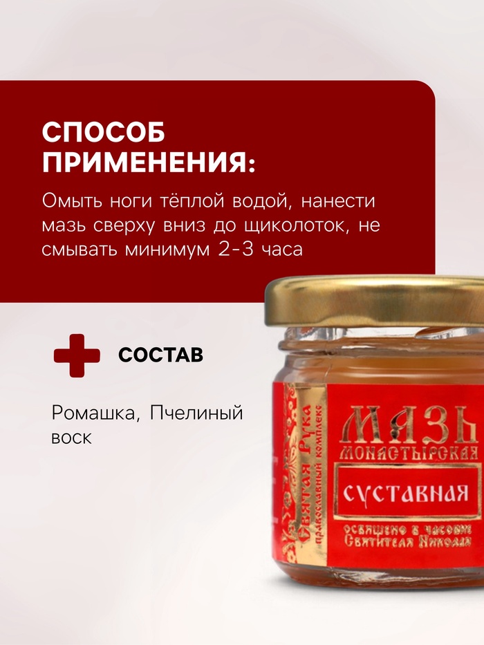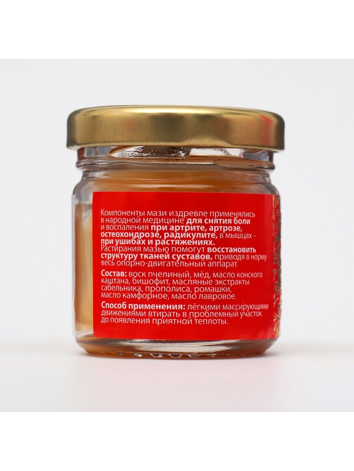 Состав: воск пчелиный, мёд, масло конского каштана, бишофит, масляные экстракты сабельника, прополиса, ромашки, масло камфорное, масло лавровое.