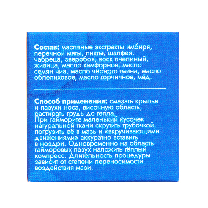 Масляные экстракты имбиря, перечной мяты, пихты, шалфея, чабреца, зверобоя, воск пчелиный, живица, масло камфорное, масло семян чиа, масло чёрного тмина, масло облепиховое, масло горчичное, мёд.
