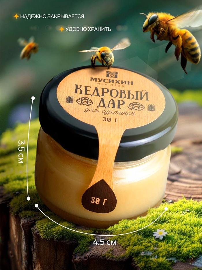 «Кедровый дар» - это коктейль из цветочного мёда и кедровой живицы, который обладает особым вкусом и уникальными свойствами. Он созревает из нектара, собранного пчёлами со сныти, дягиля, донника, клевера, и других медоносных растений горного района Алтайского края. Но главная особенность «Кедрового мёда» - живица (кедровая смола). Она обладает успокаивающим, антибактериальным, заживляющим, отхаркивающим и мочегонным эффектом. Более того, кедровая смола, добавленная в «Живой мёд», делает его вкус более ярким и насыщенным, что наверняка оценят поклонники необычных и полезных десертов.