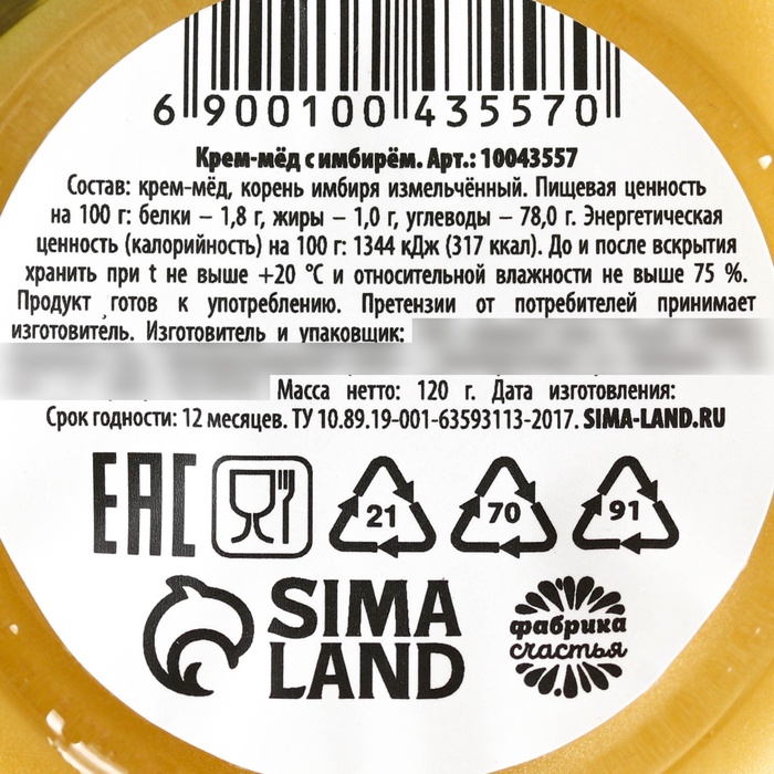 Состав: крем-мёд, корень имбиря измельчённый.