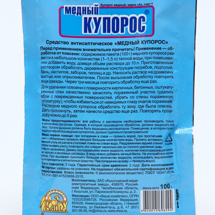 Содержимое пакета (100 г) медного купороса развести в небольшом количестве (1-1,5 л) теплой воды, при помешивании добавить воду, доведя объем раствора до 10 л. Приготовленным раствором обработать деревянные конструкции погребов, подполий, бань, настилов, заборов, теплиц и др. Наносить раствор на древесину кистью или опрыскивателем. После высыхания обработку повторить еще дважды. Через три месяца повторить обработку еще раз.