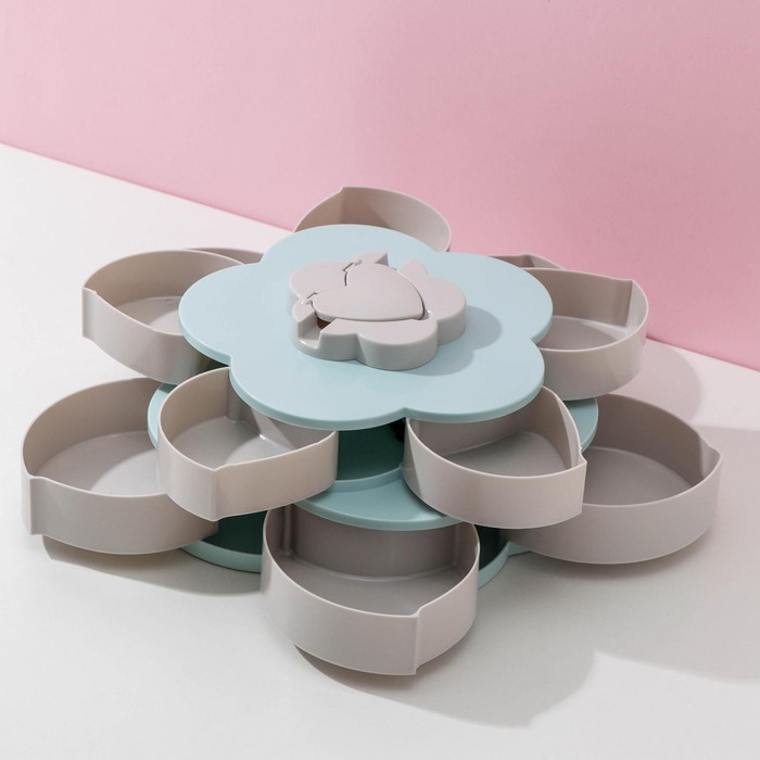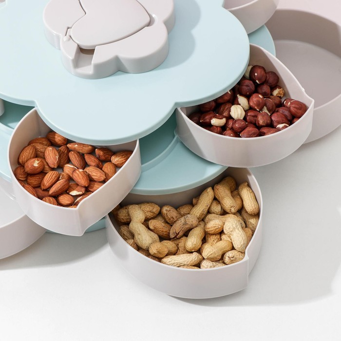 Менажница пластиковая в форме цветка - отличный повод приятно удивить гостей и домашних изысканным убранством стола, представляет собой большое блюдо с крышкой, состоящее из пяти основных и пяти дополнительных выдвижных секций. Стильная менажница станет незаменимым помощником при подаче еды на стол и быстрой сервировке. Идеально подойдет для отдыха на природе. В секции можно разложить соусы, овощи, закуски и другое.