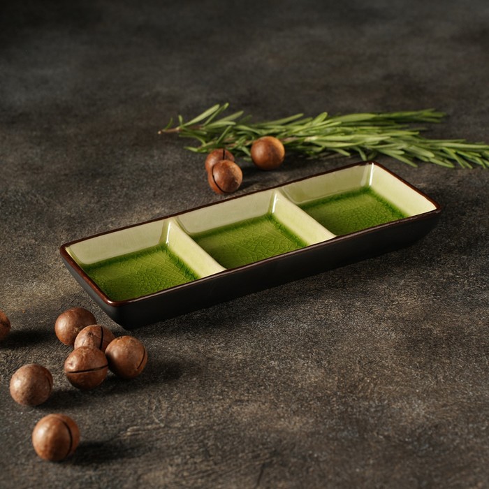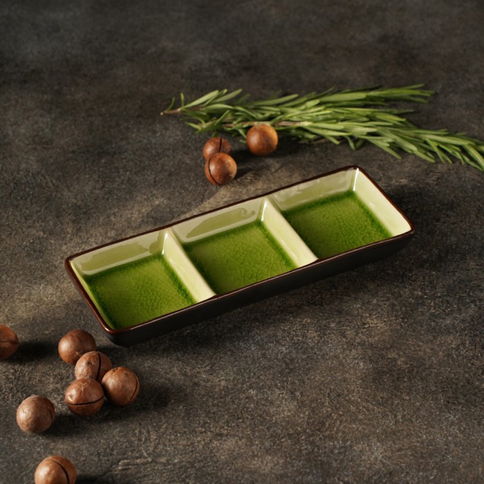 Керамическая менажница с тремя секциями — практичный аксессуар для сервировки закусок, специй, орехов или сладостей. Яркий зелёный цвет и оригинальный рисунок добавляют изделию индивидуальности, а прямоугольная форма обеспечивает удобное размещение на столе. Размеры 20.5×7.5×2.5 см делают его компактным и функциональным в любом интерьере.