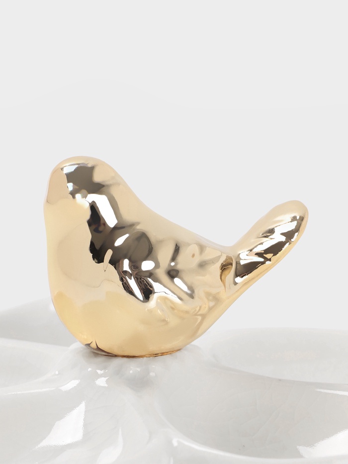- Белый фон с золотой фигуркой птицы сочетает чистоту и праздничное настроение.