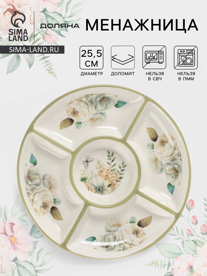 Изящная менажница из доломита с нежным цветочным рисунком. Состоит из 5 удобных секций. Идеальна для сервировки закусок, соусов, оливок и других мелочей на праздничном столе. Диаметр 25.5 см.