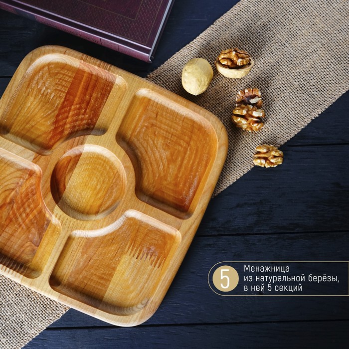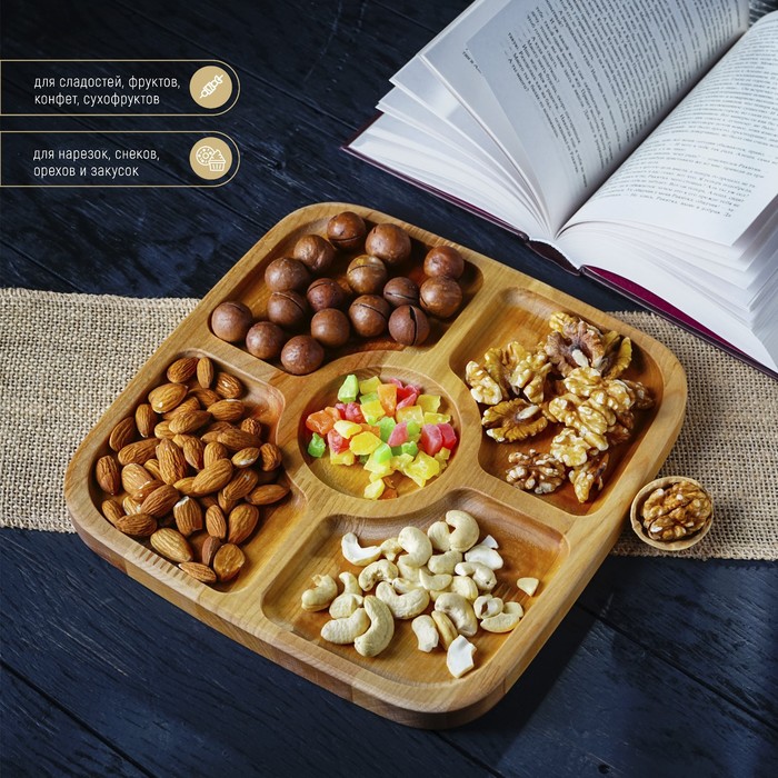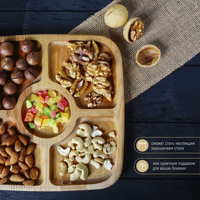 Никак не можете отучить себя от вредных перекусов? Изящная менажница из натурального дерева не даст вам пройти мимо орешков и сухофруктов. Изделие станет стильным и уютным элементом вашей кухни и незаменимым аксессуаром для сервировки стола.