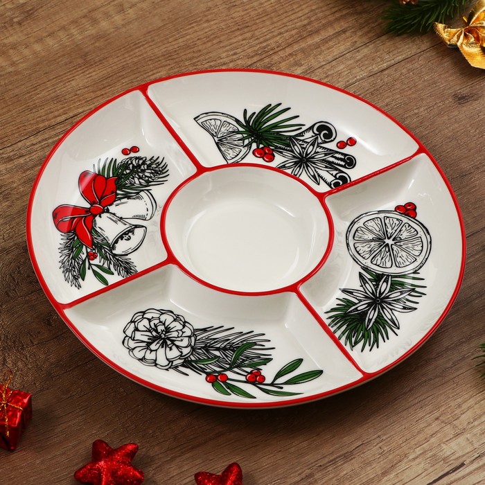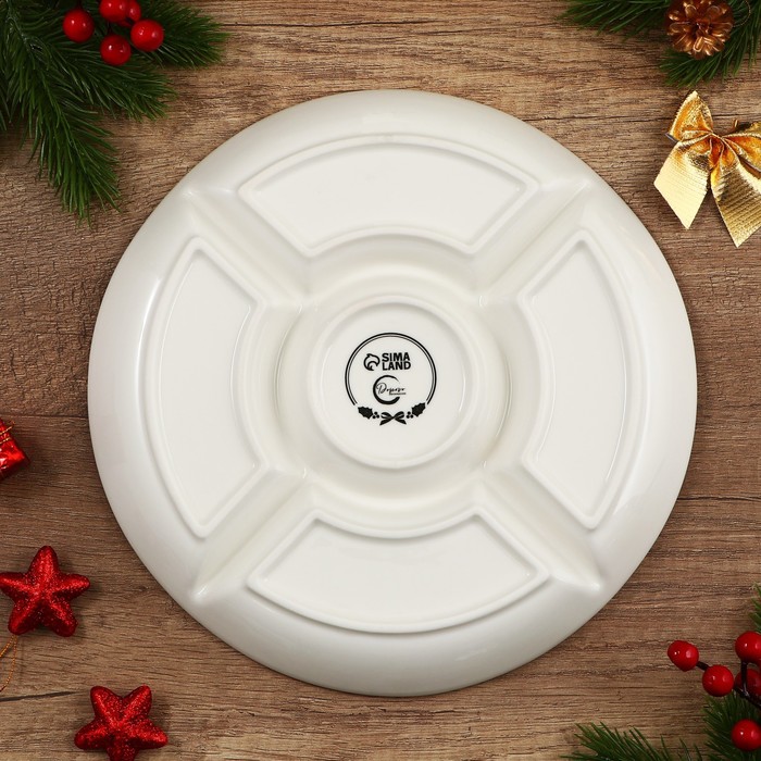 Менажница керамическая новогодняя размером 25,5 х 3 см станет отличным дополнением к вашему праздничному столу. Она выполнена из высококачественной керамики, которая не впитывает запахи и легко моется. Благодаря компактным размерам менажницу можно использовать как для подачи закусок, так и для сервировки основных блюд.