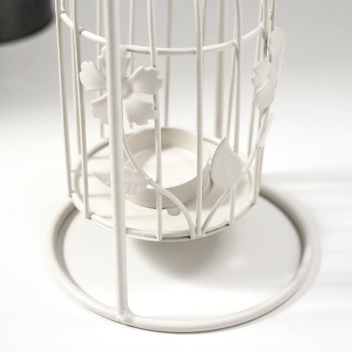 Металлический подсвечник на 1 свечу «Клетка с цветочками с розовой птицей», белый, 28.5×12×12 см