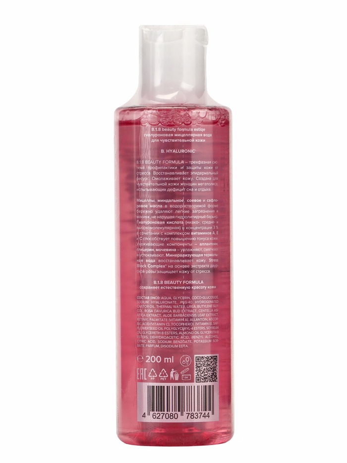 Мицеллярная вода 818 beauty formula с гиалуроновой кислотой создана для бережного очищения и ухода за чувствительной кожей. Уникальная формула эффективно удаляет макияж и загрязнения, сохраняя естественный баланс влаги и предотвращая сухость.