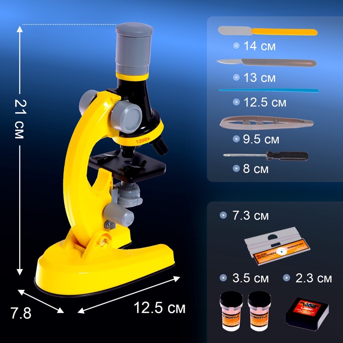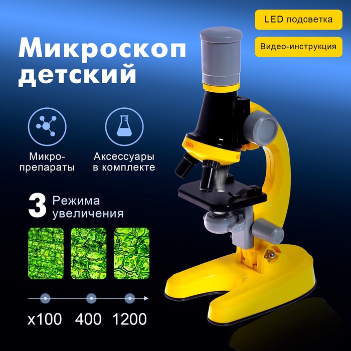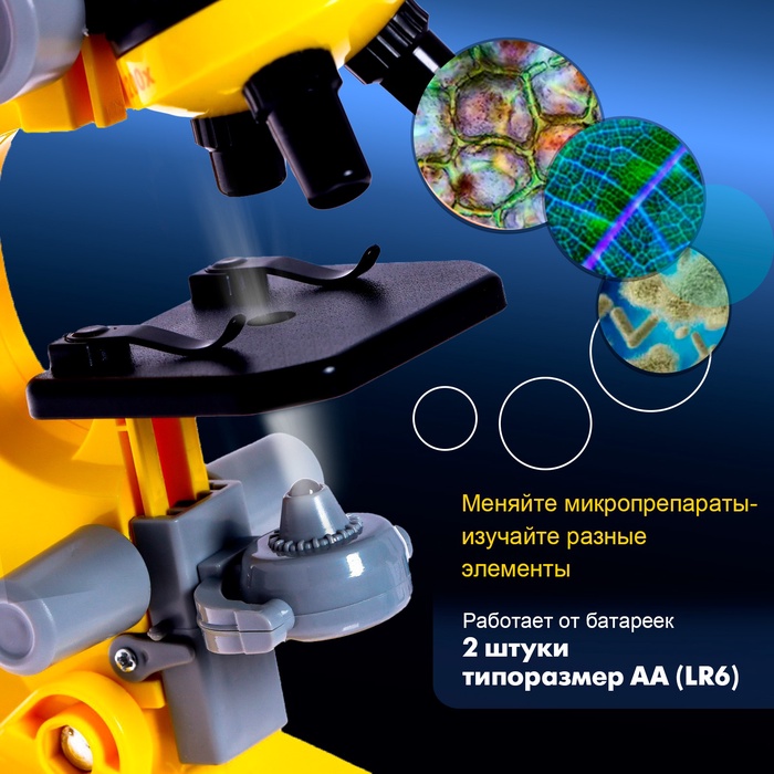 Микроскоп подойдёт начинающим юным исследователям, которым интересно познавать окружающий мир и хочется блеснуть знаниями на уроках биологии и окружающего мира. Увеличительные линзы в 100, 400 и 1 200 крат позволяют детально рассмотреть, например, клетки растений, строение насекомых, пыльцу цветов.